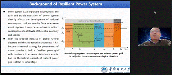 华南理工大学的唐文虎教授在题为《Power System Resilience Assessment And Enhancement Measures Under Extreme Events》报告中介绍了电力系统弹性的概念。弹性这个概念最早在1973由生物学家提出,应用在了多个领域,近年来对弹性的关注不断提高。本报告中的弹性主要表现为电力系统在极端环境下的反应,针对的是电力系统中小概率大风险的事件。唐教授介绍了电力系统的弹性评估体系和纯电力系统以及考虑信息系统情况下的弹性提升方法。