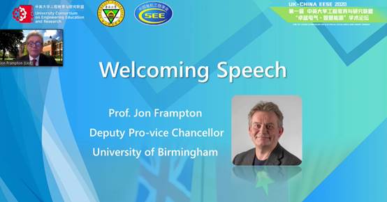 伯明翰大学副校长Jon Frampton总结了中英大学工程教育与研究联盟(UCEER)的建立和发展历程,回顾了疫情以来高校教育和交流合作方式的变化,他表示此次线上论坛的举办充分证明了中英大学工程教育与研究联盟高校之间的紧密交流不会因为全球性的新冠肺炎疫情而止步,并希望通过此次论坛的圆满举办可以进一步促进未来的合作。