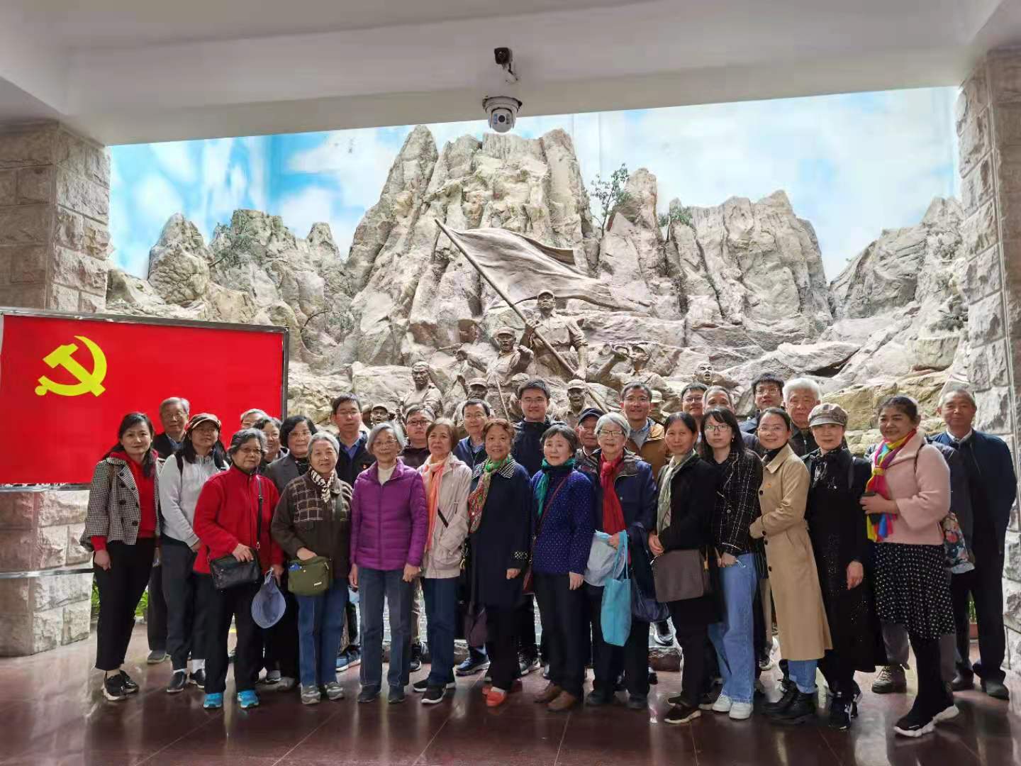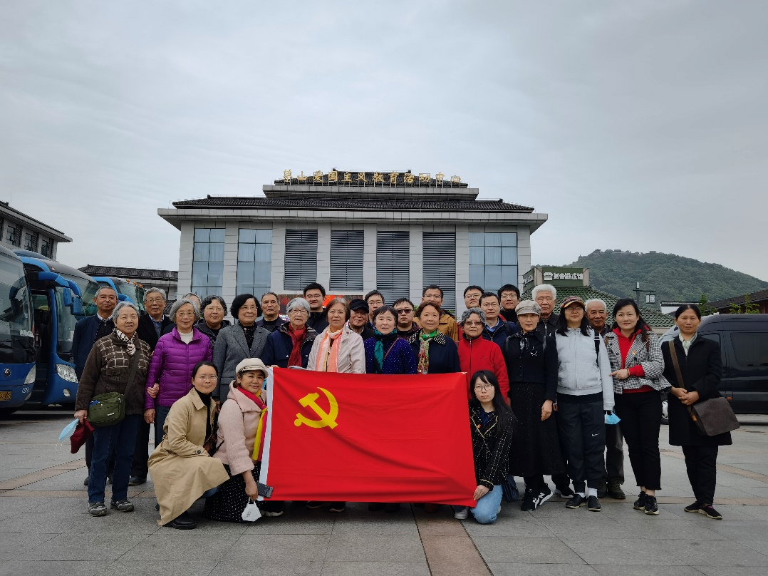 退休党支部、电力工程系党支部党员在纪念馆门前合影