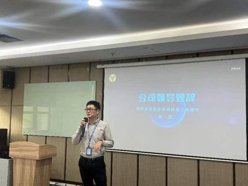 首先由曹奕老师致辞。曹老师表达了对中兴通讯提供此次参观交流机会的感谢,接着希望同学们能够借本次中兴之行的机会更加深入地了解数字能源这一研究热点,最后表达了对电气学院与中兴通讯达成更深入的科研的交流、共建的期冀。