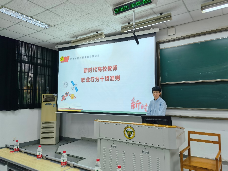 会上,吴在军领学《新时代高校教师职业行为十项准则》,围绕“坚定政治方向、自觉爱国守法、传播优秀文化、潜心教书育人、关心爱护学生、坚持言行雅正、遵守学术规范、秉持公平诚信、坚守廉洁自律、积极奉献社会”等方面的内容进行深入解读,帮助教师全面理解和准确把握其内涵要义。