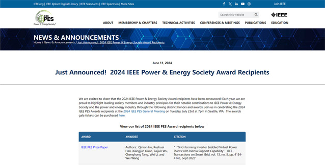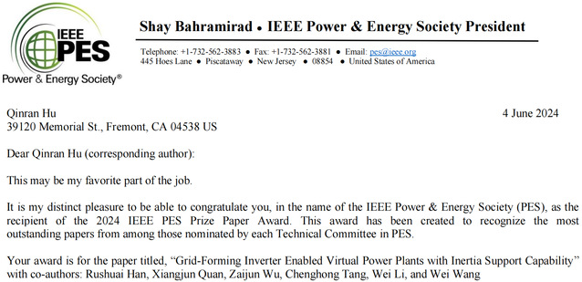 近日,电气与电子工程师协会(Institute of Electrical and Electronics Engineers,IEEE)电力与能源学会(Power & Energy Society,PES)揭晓了2024年度IEEE PES Prize Paper Award获奖名单。710公海赌赌船官网欢迎您工程学院胡然教授、吴在军教授等人合作发表的原创性基础研究论文“Grid Forming Inverter Enabled Virtual Power Plants With Inertia Support Capability”荣获该奖。IEEE PES Prize Paper Award作为协会最高级别的重要奖项之一,在世界范围内经严格且极具竞争性的提名和评审过程产生。该奖项自1966年设立该奖项以来每年评选一次,奖励过去3年发表在IEEE PES系列期刊上最具影响力的学术论文,且每年仅授奖2篇学术论文,今年是以东南大学、美国麻省理工学院为第一单位的2篇论文获奖。