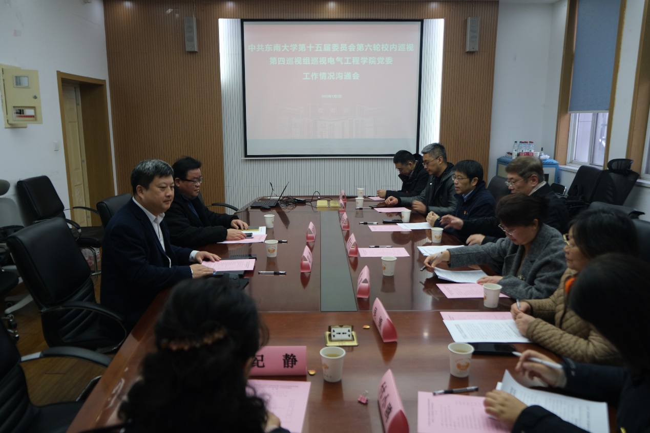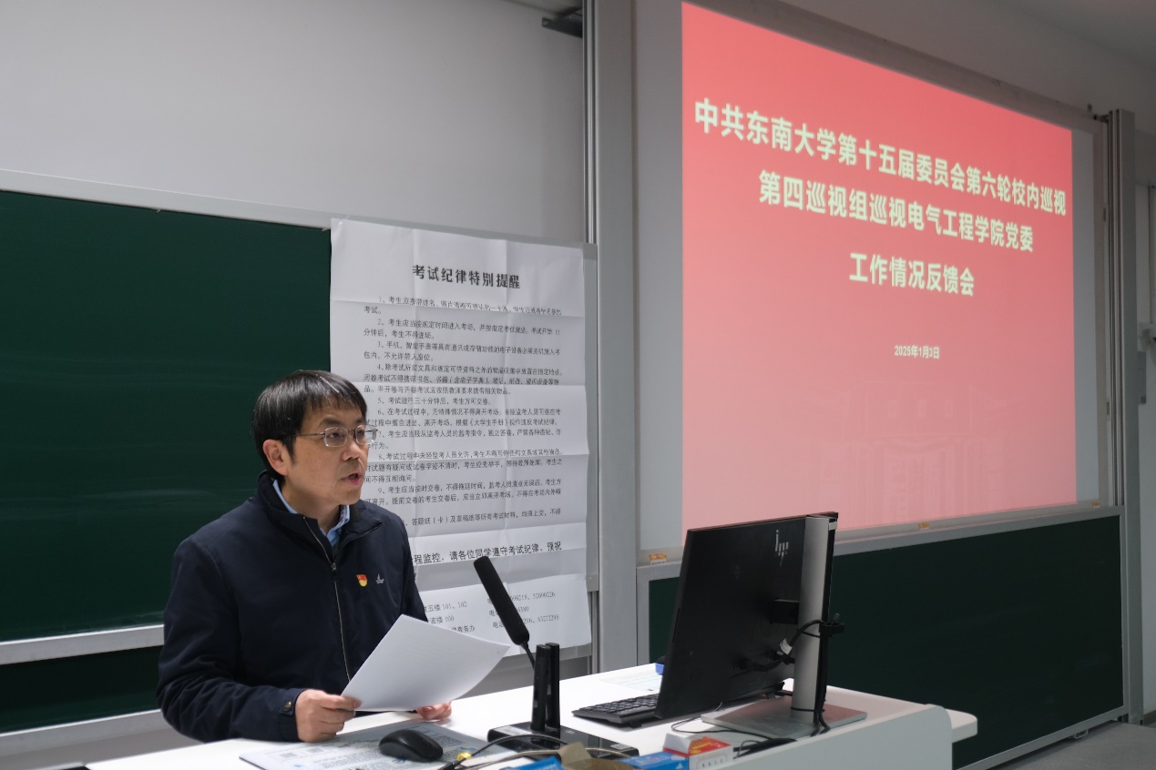根据第十五届校党委关于校内巡视工作的统一部署,校党委第四巡视组巡视电气工程学院党委工作情况反馈会于2025年1月3日下午在四牌楼校区五四楼104举行。校党委常委、副校长黄大卫,第四巡视组组长张在琛、副组长汤顶华、副组长周明阳及全体组员,校纪委副书记兼纪检监察机构办公室主任吴娟、校党委巡视工作办公室主任李瑛、校党委组织部副部长付小鸥、校党委巡视工作办公室副主任纪静出席了会议。学院领导班子成员和教师、学生、退休教职工代表参加了大会。会议由副院长(主持工作)花为主持。