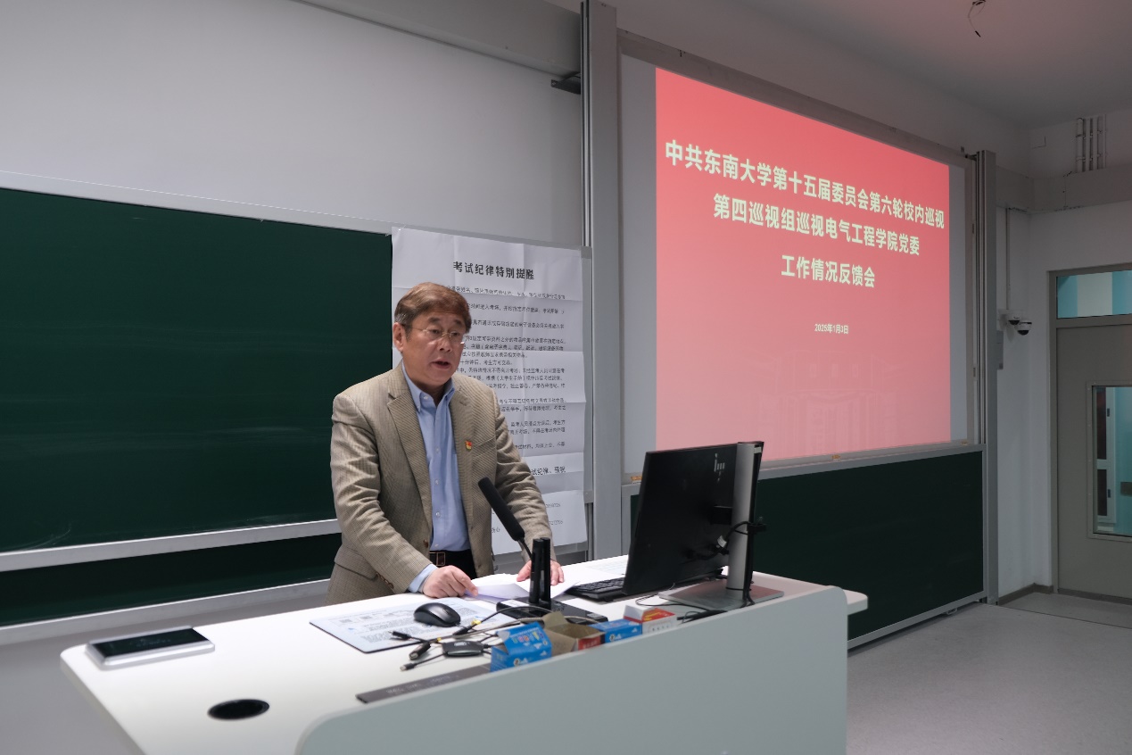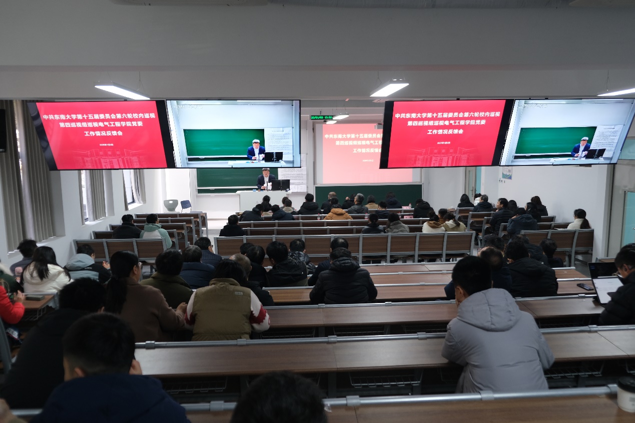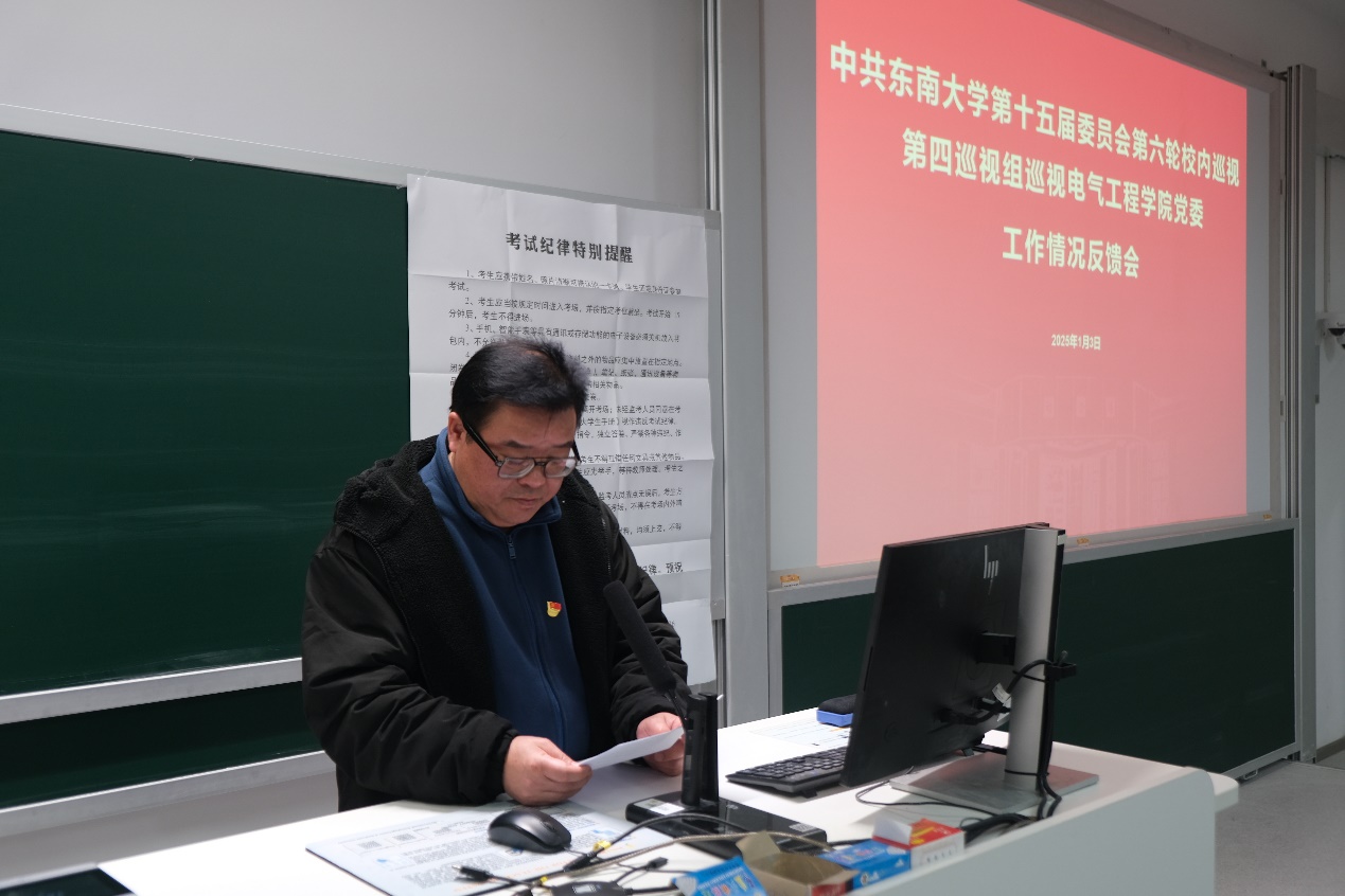 巡视组组长张在琛宣读了《东南大学十五届党委第六轮第四巡视组关于巡视电气工程学院党委的反馈意见》,巡视组在肯定学院各项成绩的同时,也客观负责地指出了巡视发现的问题和不足,并有针对性地提出了整改意见和建议。