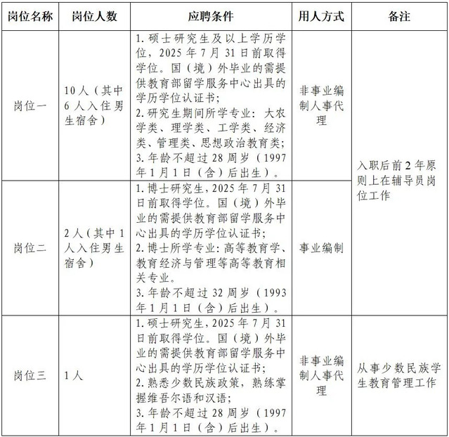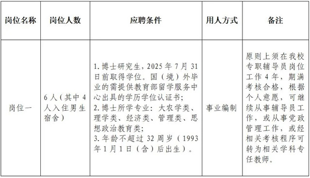 一 1 辅导员岗位 2 管理人员岗位 二 (一)具有中华人民共和国国籍,遵守中华人民共和国宪法和法律。 (二)中共党员(含中共预备党员)。 (三)拥护中国共产党的领导,热爱祖国,热爱高等教育事业和高校工作,思想政治素质高。 (四)遵纪守法、品行端正,团结协作,廉洁奉公;身心健康,具备岗位所必需的身体素质和心理素质。 (五)具有1年及以上学生干部经历,具有较强业务能力、文字语言表达能力和组织协调能力。 注:学生干部包括班级(团支部)班长(书记)或党支部委员,院系学生会(团委、研究生会)部长副职及以上职务,校学生会(团委、研究生会)部长副职及以上职务,攻读博士学位期间的实验室管理学生负责人、校级研究生助管。 (六)国家和江苏省另有规定不得应聘到事业单位有关岗位的人员,不得应聘。 三 (一)报名申请 凡符合条件的应聘人员可登录“南京农业大学网上招聘系统”(以下简称“招聘系统”,招聘系统网址:http://zp.njau.edu.cn/),填报个人信息并提交相关附件,首次登录招聘系统需注册。(注:推荐使用GoogleChrome浏览器或360极速浏览器的极速模式) 每位应聘者只能报名管理岗和辅导员岗中的一个岗位,报名截止时间:2025年4月21日17:00。 相关附件按以下顺序汇编为1份PDF文件,文件命名为“学校+姓名”上传至“招聘系统-其他附件”处,其中,纸质原件须扫描后汇总: 1.《南京农业大学专职辅导员、管理人员应聘申请表》(详见附件),并由本人签名。 2.党员证明。须由近12个月内应聘者所在单位的组织部门或二级党组织出具。 3.已取得的各层次学历、学位证书(在国外取得学历学位的,须提供由教育部留学服务中心出具的《国外学历学位认证书》扫描件一份)。未取得学历学位证书的应届毕业生,须从学信网下载《教育部学籍在线验证报告》,且需要同步提供已取得的学历学位证书扫描件。 4.身份证复印件和近期全身彩照一张。 5.学生干部经历。院级主要学生干部经历须由学院党委出具证明,校级主要学生干部经历须由校团委、学生管理部门出具证明,实验室管理学生负责人由导师签字并学院盖章证明,以上证明中须明确任职职务和任职起止时间(具体到月份)。 6.课程成绩单、英语水平证明、荣誉证明等证明材料。 (二)考核 (三)体检与政审 (四)公示 (五)聘用 四 1.应聘者须如实准确提供、填报相关信息和材料。凡发现有任何弄虚作假或隐瞒实情等行为,一经查实,立即取消应聘资格或解聘。 2.学校同意聘用的人员,应在约定时间内办理相关手续,逾期视为自动放弃。 五 人力资源处:025-84395361 学生工作部(处):025-84395272 六 学校监察处负责对此次招聘工作进行监督。 监督电话:025-84396827