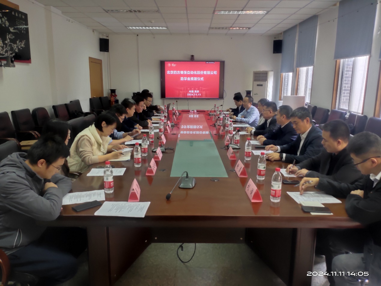 2024年11月11日下午,北京四方瑞祥公益基金会向学院捐赠助学金签约仪式在学院318会议室成功举行。北京四方继保自动化股份有限公司总裁助理徐刚、北京四方瑞祥公益基金会秘书长张翠红等捐赠方代表,学校发展委员会副主任蒋玮、发展规划与学科建设处副处长顾伟、教育基金会副秘书长宋云燕,学院全体领导班子成员出席会议,仪式由学院党委书记郑建勇主持。
