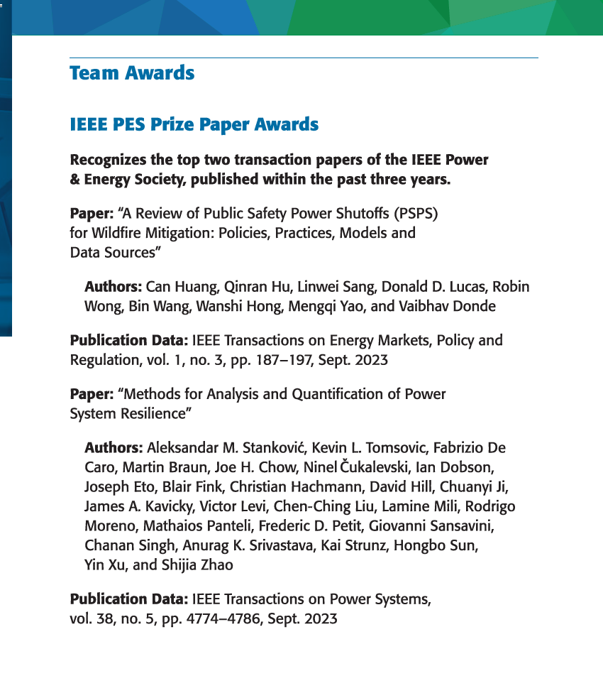 近日,国际电气与电子工程师协会电力与能源学会(IEEE Power & Energy Society, PES)公布了2025年度学会大奖(Society-Level Awards)评选结果。710公海赌赌船官网欢迎您工程学院黄灿(第一作者)、胡秦然(通讯作者)、桑林卫与国际专家合作发表的研究论文 “A Review of Public Safety Power Shutoffs (PSPS) for Wildfire Mitigation: Policies, Practices, Models and Data Sources”荣获IEEE PES Prize Paper Award。IEEE PES Prize Paper Award是IEEE PES设立的最高荣誉之一,自1966年设立以来,每年评选一次,旨在表彰过去三年内发表于PES所属各大期刊中最具影响力的学术论文。该奖项评审严格、竞争激烈,每年全球仅有两篇论文获奖,具有极高的国际声誉和学术认可度。